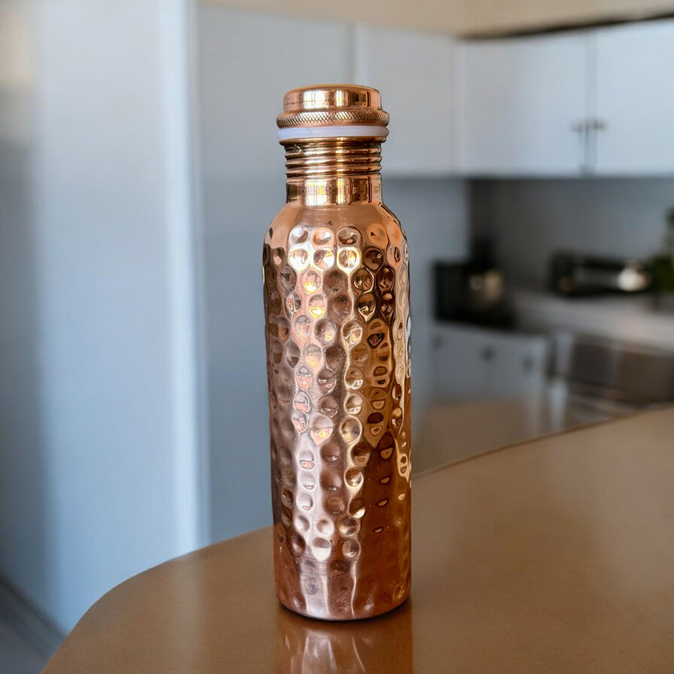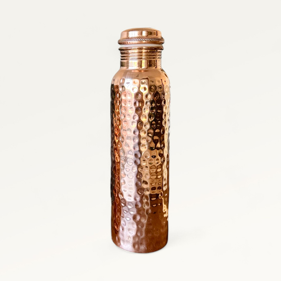 Tamra Jal, la pratique ayurvédique ancestrale, vous invite à bénéficier des propriétés revitalisantes de l’eau cuivrée tridoshique grâce à notre gourde en cuivre pur, martelée à la main en Inde.